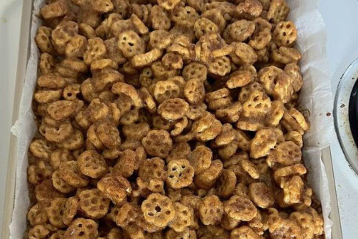 Transfer cereal to the prepared baking sheet and bake for 8 minutes, stirring halfway through.
