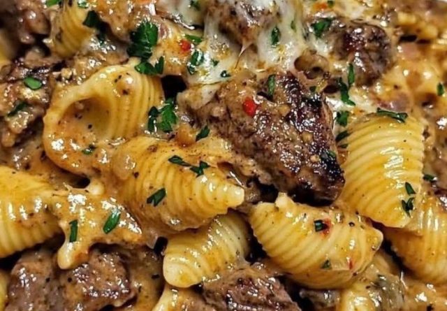 7. Add the cooked pasta shells and steak pieces back to the skillet. Gently toss everything together until the pasta and steak are evenly coated in sauce.