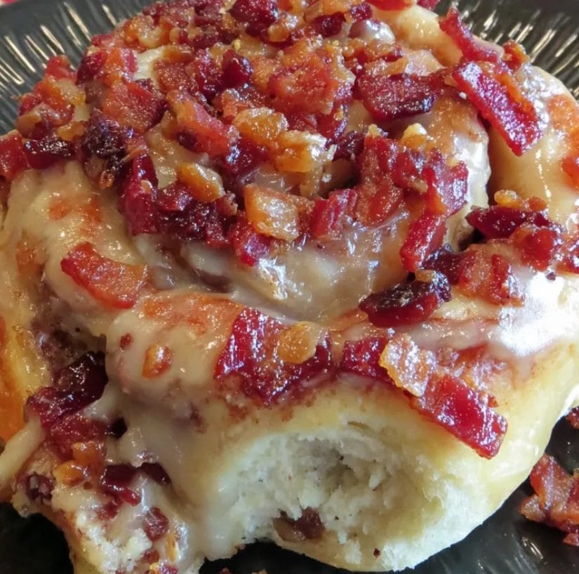 Soft cinnamon rolls with crispy bacon and maple glaze for an irresistible sweet and savory treat.