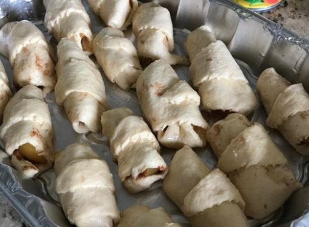 - Place one or two peach slices (depending on size) at the wide end of the dough triangle. Sprinkle with a pinch of cinnamon and roll dough around peach.