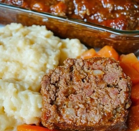 Let the loaf sit for 10 minutes and then slice. Enjoy the meatloaf warm with mashed potatoes and green beans or roasted veggies.