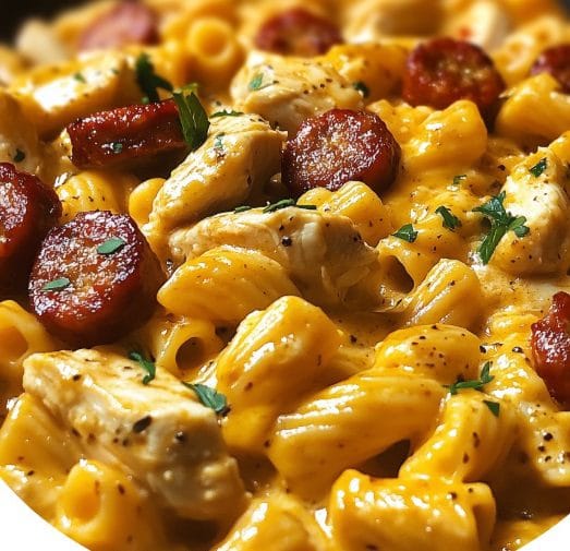A creamy, smoky pasta dish combining tender chicken, flavorful sausage, and sharp cheddar in a zesty ranch sauce. This one-pot meal is perfect for busy weeknights or casual family dinners, delivering comfort and ease in every bite.
