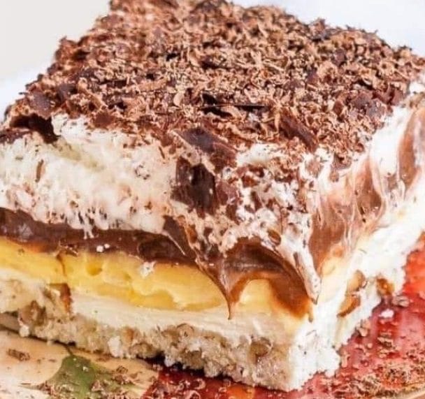 Let the crust cool. Spread the cream cheese mixture over the crust evenly. Spread the chocolate pudding over the cream cheese, then the vanilla pudding. Top with the whipped cream and sprinkle with the chocolate.
